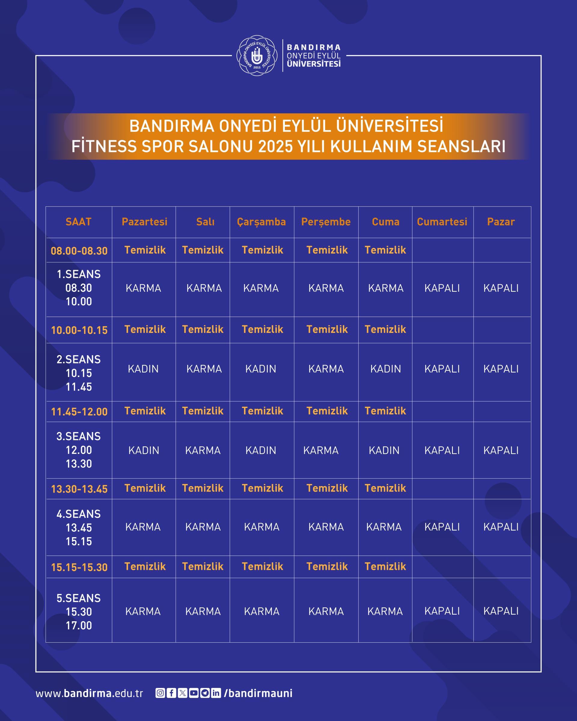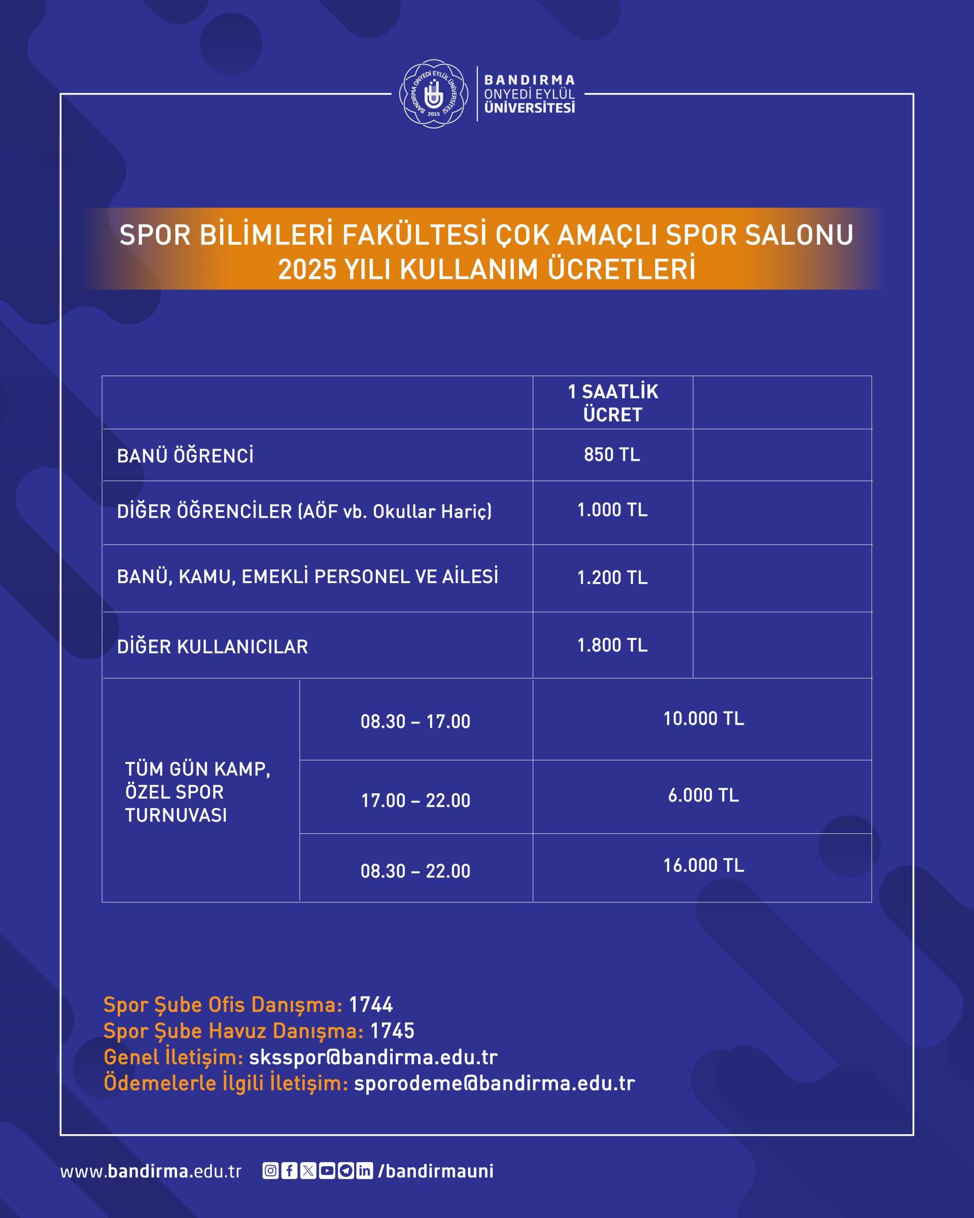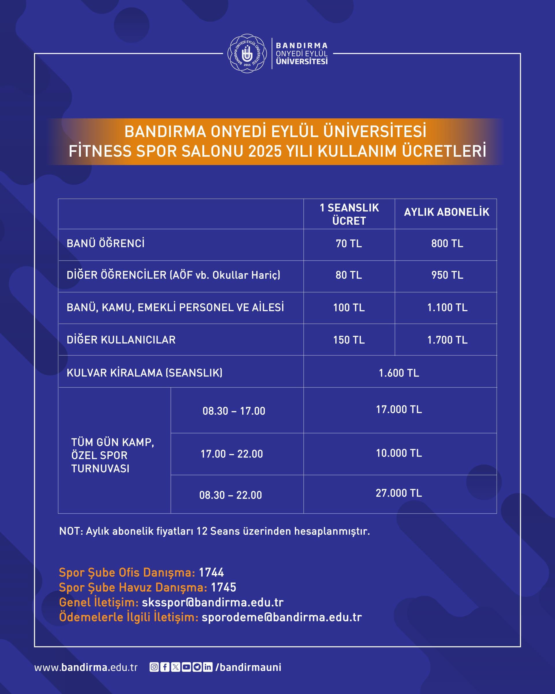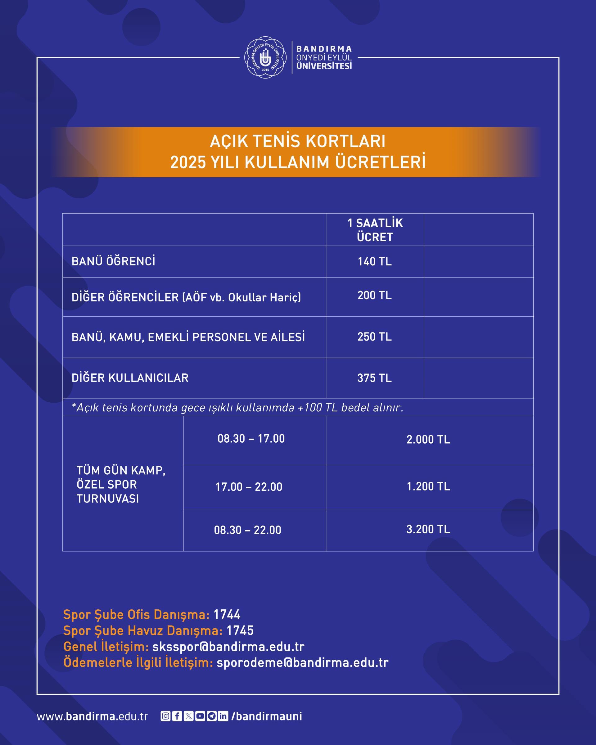 Üniversitemiz Merkez Yerleşkesinde bulunan tüm spor tesisleri, 28 Temmuz 2025 Pazartesi gününden itibaren faaliyetlerine başladı. Geniş katılımcı kitlesine hitap eden bu tesisler; öğrencilerimiz, akademik ve idari personelimiz, personel yakınları ile Bandırma halkının kullanımına açıktır.