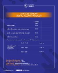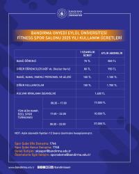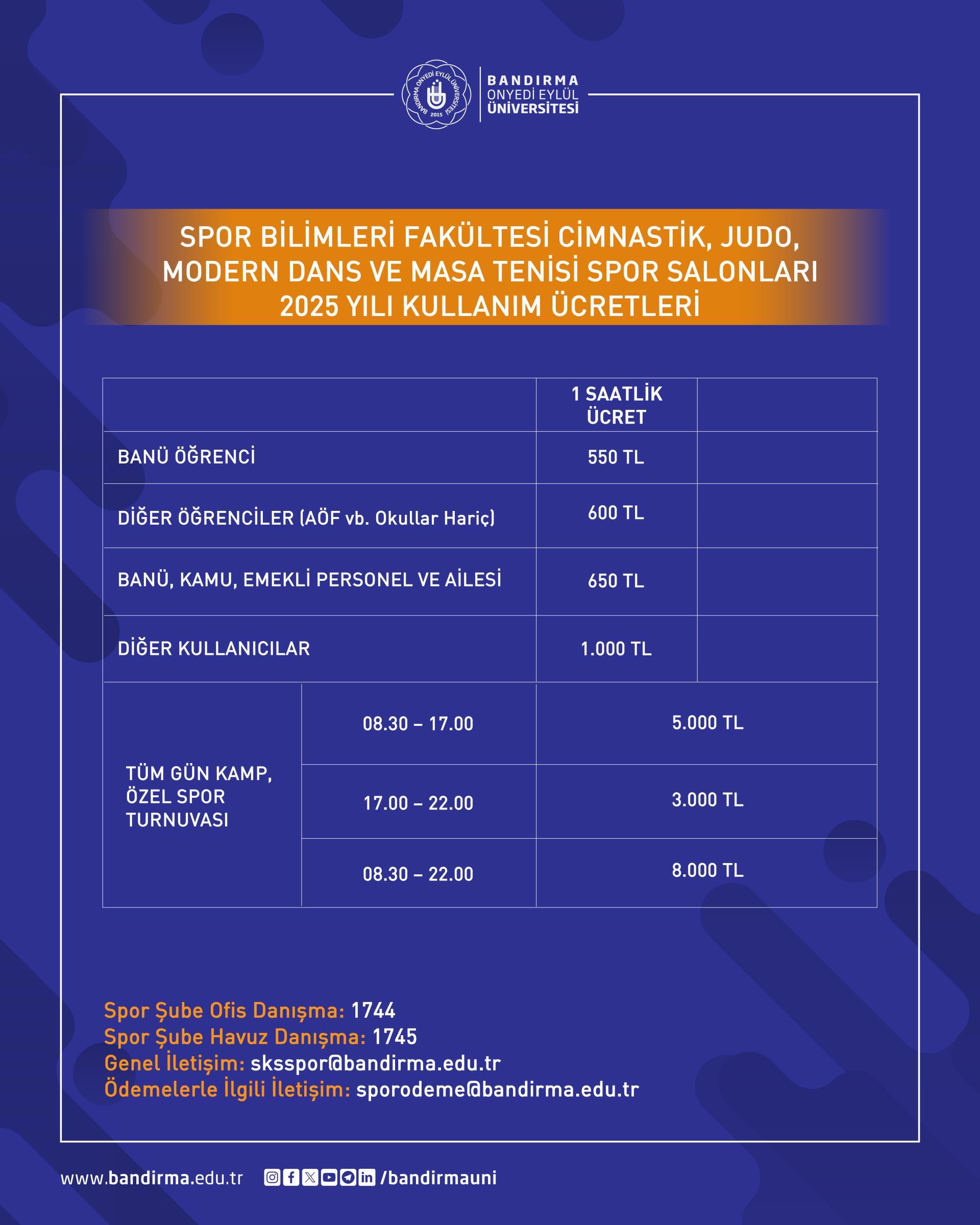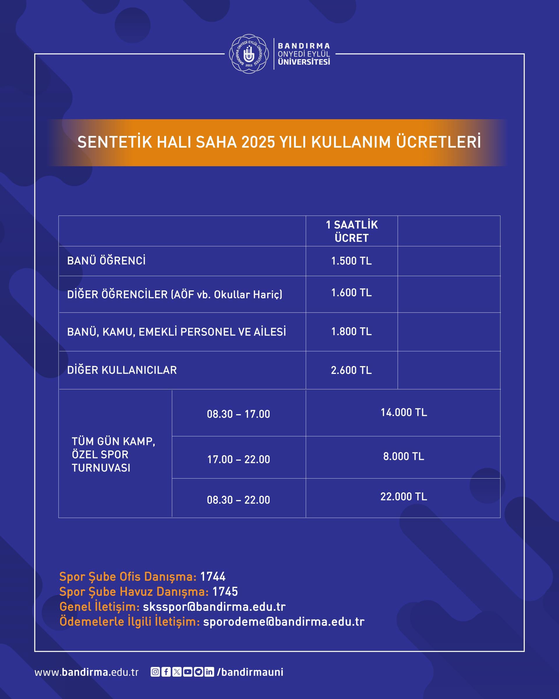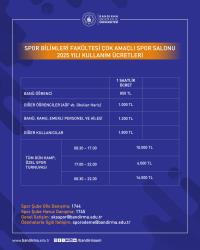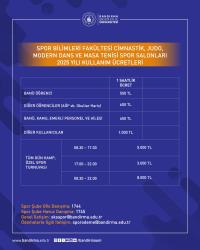 Tesislerden yararlanmak isteyen tüm kullanıcılarımız için hazırlanan ücretlendirme tablosu aşağıda yer almaktadır. Belirtilen ücretlerin, ilgili banka hesabına yatırılması gerekmektedir.