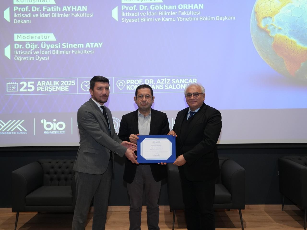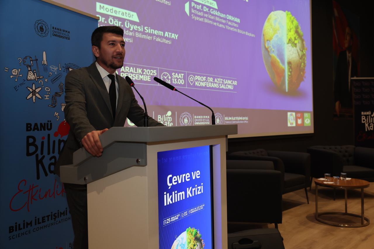 Dr. Öğr. Üyesi Sinem Atay, çevre ve iklim krizine ilişkin dünyada meydana gelen güncel kriz örneklerini aktarırken; Prof. Dr. Gökhan Orhan, “Çevre ve İklim Krizi” başlıklı sunumunda konuyu siyasal ve yönetsel boyutlarıyla ele aldı. Prof. Dr. Fatih Ayhan ise yaptığı sunumda, ülkelerin iklim krizine etkilerini veriler üzerinden değerlendirerek ekonomik ve yapısal sonuçlara dikkat çekti.