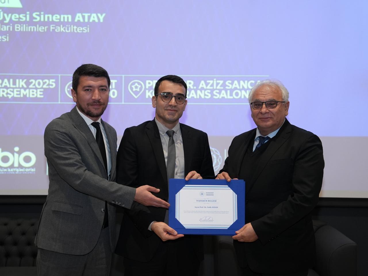 Program, soru-cevap bölümünün ardından sona erdi. Etkinlik sonunda, konuşmacılara katkılarından dolayı teşekkür plaketi; Rektör Yardımcımız Prof. Dr. Alpaslan Serel ile Bilim İletişimi Ofisi Koordinatörümüz Öğr. Gör. Muhammet Yörübulut tarafından takdim edildi. Program, günün anısına çekilen toplu hatıra fotoğrafı ile tamamlandı.
