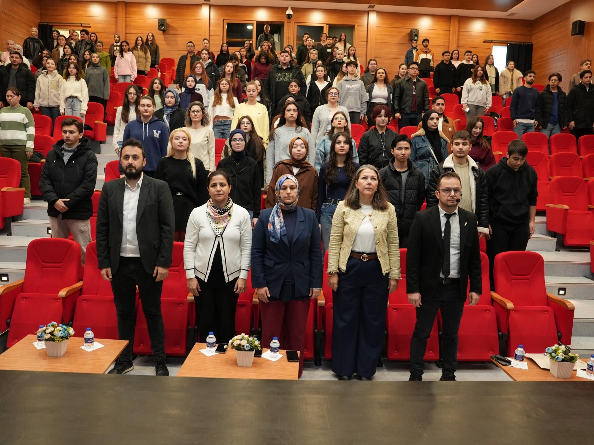 Akademik ve idari personel ile öğrencilerin yoğun ilgi gösterdiği program, saygı duruşu ve İstiklal Marşı’nın okunmasının ardından başladı. Programın açış konuşması, Sağlık Hizmetleri Meslek Yüksekokulu Müdürümüz Dr. Öğr. Üyesi Fatma Nur Yılmaz tarafından yapıldı.