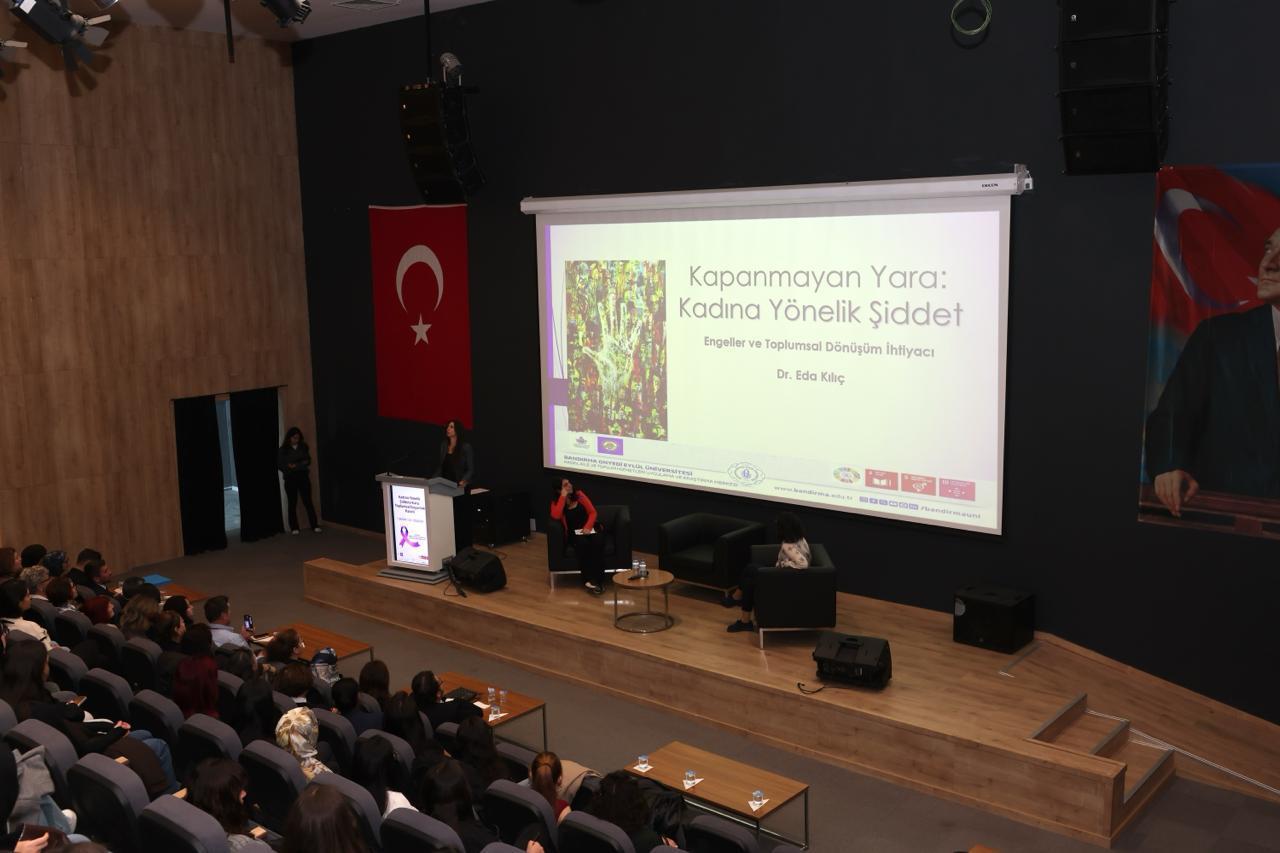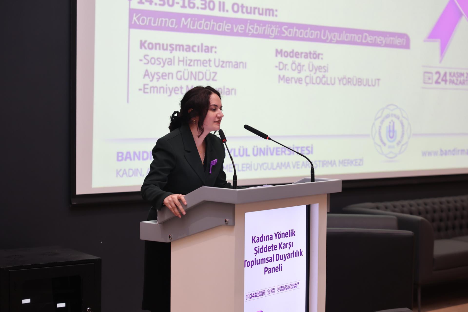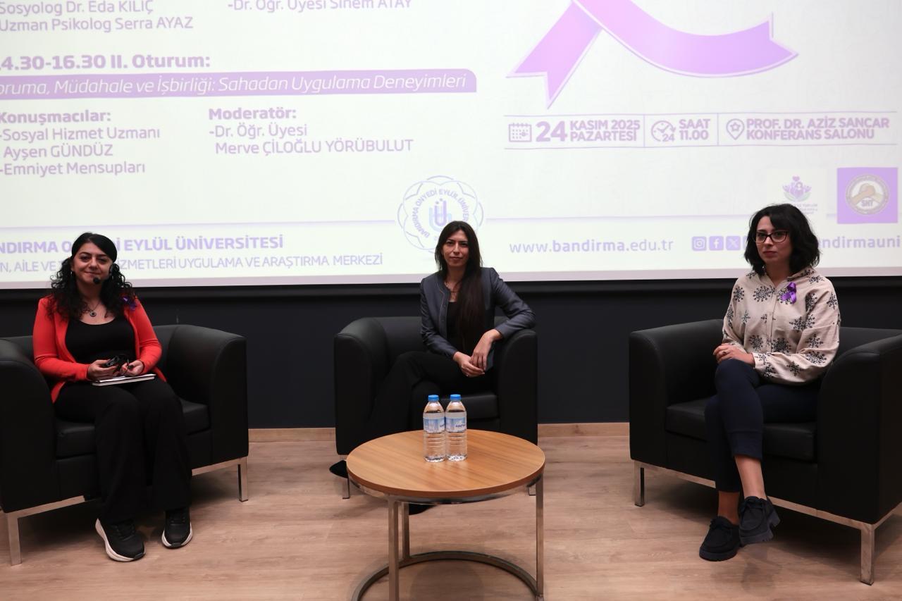 Kadın, Aile ve Toplum Hizmetleri Uygulama ve Araştırma Merkezimiz (BANÜ-KAT) ile Sosyal Hizmet Topluluğumuz tarafından, 25 Kasım Kadına Yönelik Şiddete Karşı Uluslararası Mücadele Günü kapsamında bir panel gerçekleştirildi. Prof. Dr. Aziz Sancar Konferans Salonu’nda gerçekleştirilen panel, saygı duruşu ve İstiklal Marşı’nın okunmasıyla başladı. Programa; Rektörümüz Prof. Dr. İsmail Boz’un eşi Sibel Boz, İktisadi ve İdari Bilimler Fakültesi Dekanımız Prof. Dr. Serap Palaz Çakır, öğretim üyelerimiz, kadın dernekleri temsilcileri, basın mensupları ile öğrencilerimiz katılım sağladı.