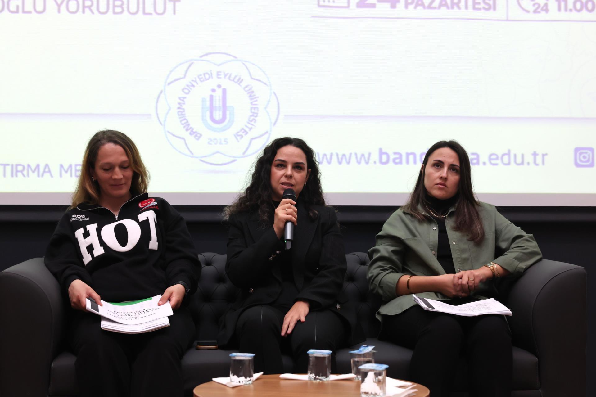 Panel, BANÜ-KAT Müdürü Doç. Dr. Zeynep Aca’nın açış konuşmasıyla başladı. “Şiddetin Arka Planı: Sosyolojik ve Psikolojik Perspektifler” başlıklı ilk oturumda; Sosyolog Dr. Eda Kılıç ve Uzman Psikolog Serra Ayaz konuşmacı olarak yer aldı. Oturumun moderatörlüğünü İktisadi ve İdari Bilimler Fakültesi öğretim üyemiz Dr. Öğr. Üyesi Sinem Atay üstlendi. Sosyolog Dr. Eda Kılıç şiddetin sosyolojik boyutunu ele alırken, Uzman Psikolog Serra Ayaz ise şiddetin psikolojik etkilerini kapsamlı şekilde ele aldı. Oturum sonunda Sibel Boz, Prof. Dr. Serap Palaz Çakır ve Prof. Dr. Aybeniz Akdeniz Ar tarafından konuşmacılara teşekkür belgeleri takdim edildi.