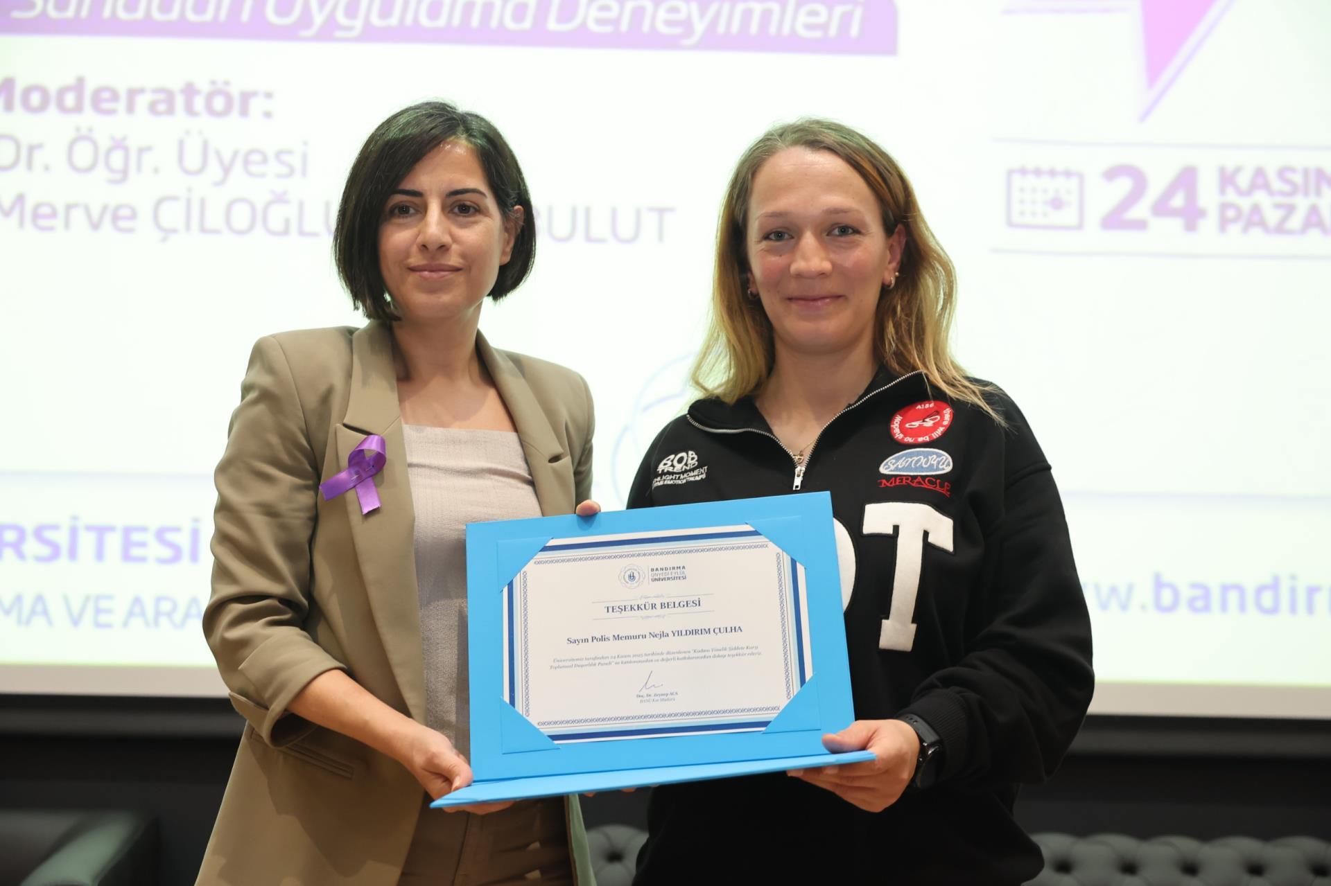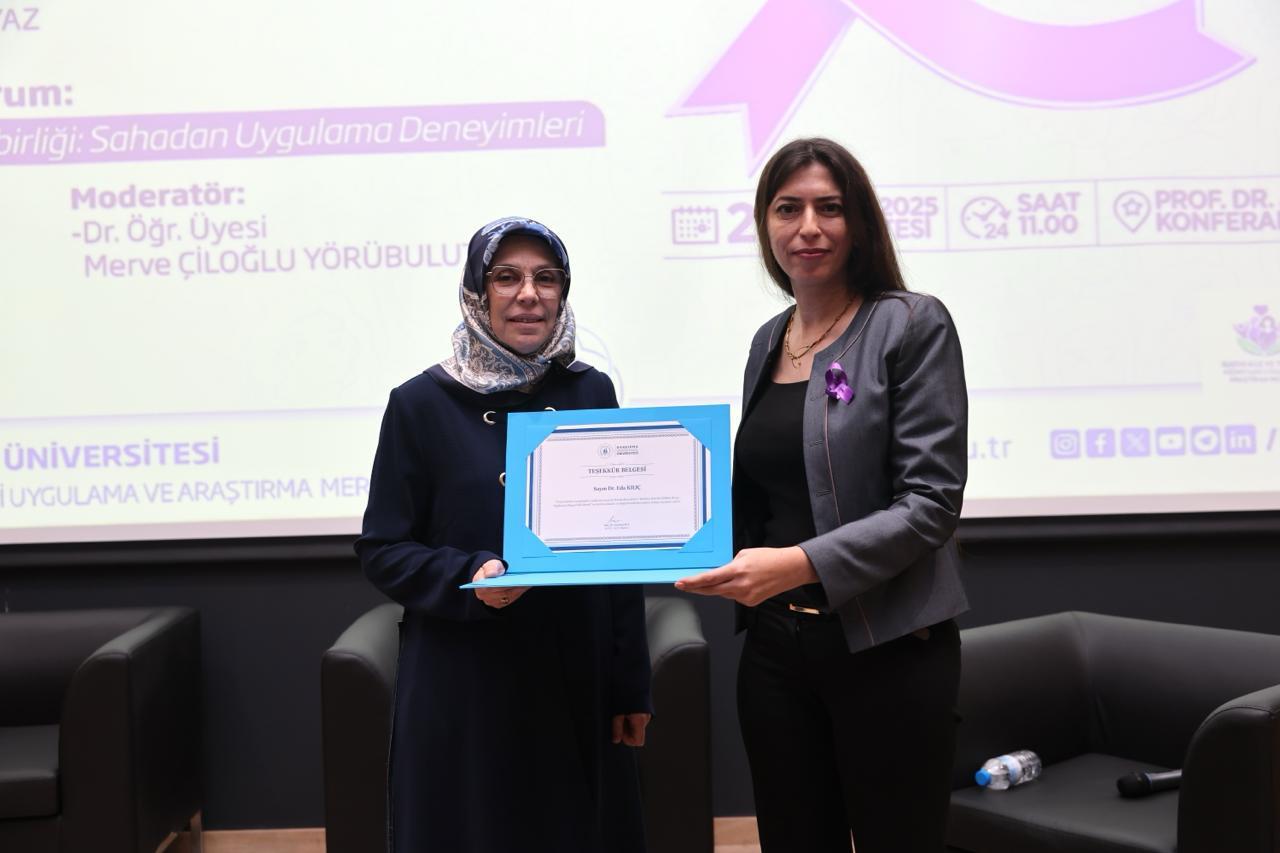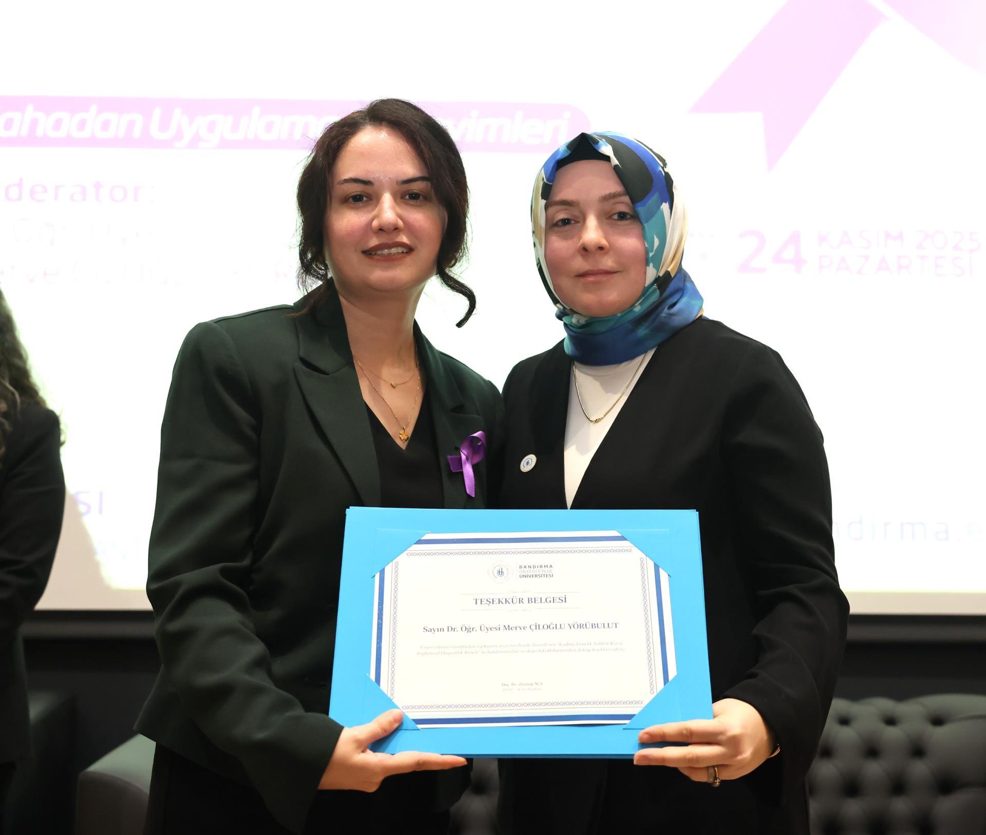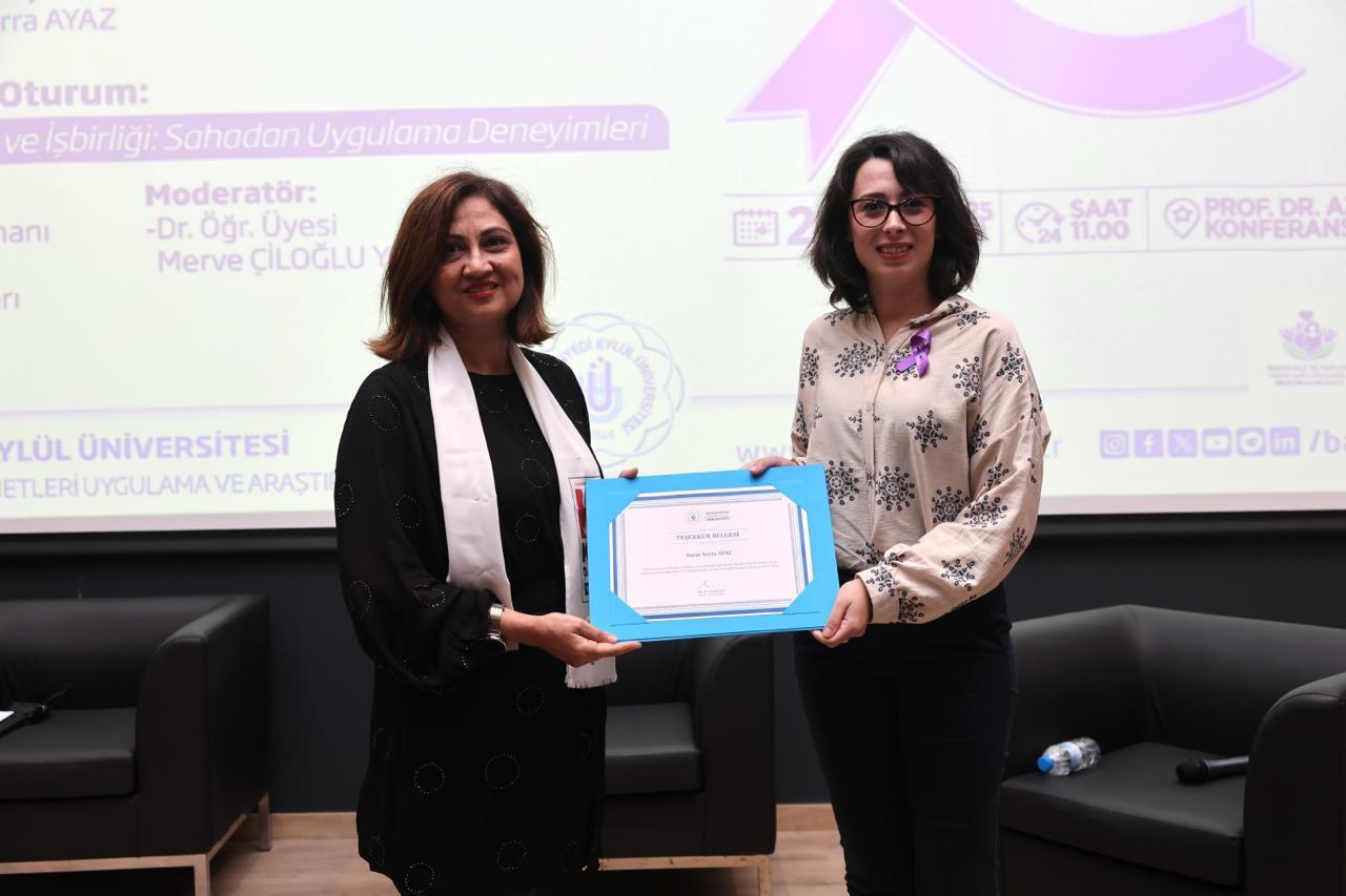 “Koruma, Müdahale ve İşbirliği: Sahadan Uygulama Deneyimleri” başlıklı ikinci oturumda ise Sosyal Hizmet Uzmanı Ayşen Gündüz ve Bandırma İlçe Emniyet Müdürlüğü’nde görevli Başkomiser Hilal Sert, polis memurları Nejla Yıldırım Çulha ve Elif Sili, uygulamaya dair saha deneyimlerini paylaştı. Oturumun moderatörlüğünü İktisadi ve İdari Bilimler Fakültesi öğretim üyemiz Dr. Öğr. Üyesi Merve Çiloğlu Yörübülut üstlendi. Dinleyicilerin katkılarıyla interaktif şekilde ilerleyen oturumun sonunda Prof. Dr. Recep Yıldız, Doç. Dr. Zeynep Aca ve Dr. Öğr. Üyesi Gizem Burcu Karaali tarafından katılımcılara teşekkür belgeleri sunuldu.