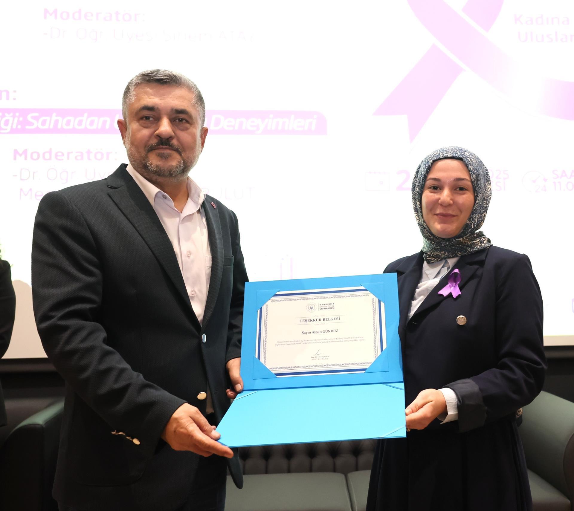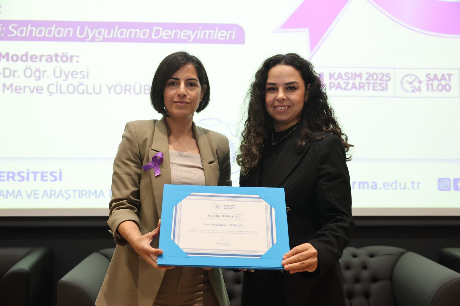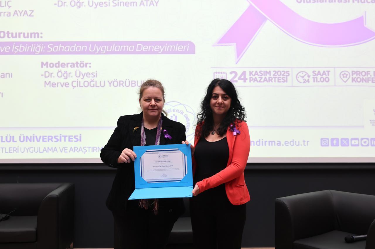 “Koruma, Müdahale ve İşbirliği: Sahadan Uygulama Deneyimleri” başlıklı ikinci oturumda ise Sosyal Hizmet Uzmanı Ayşen Gündüz ve Bandırma İlçe Emniyet Müdürlüğü’nde görevli Başkomiser Hilal Sert, polis memurları Nejla Yıldırım Çulha ve Elif Sili, uygulamaya dair saha deneyimlerini paylaştı. Oturumun moderatörlüğünü İktisadi ve İdari Bilimler Fakültesi öğretim üyemiz Dr. Öğr. Üyesi Merve Çiloğlu Yörübülut üstlendi. Dinleyicilerin katkılarıyla interaktif şekilde ilerleyen oturumun sonunda Prof. Dr. Recep Yıldız, Doç. Dr. Zeynep Aca ve Dr. Öğr. Üyesi Gizem Burcu Karaali tarafından katılımcılara teşekkür belgeleri sunuldu.