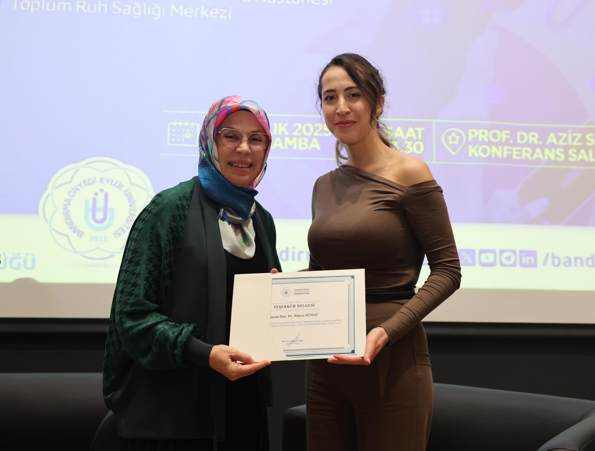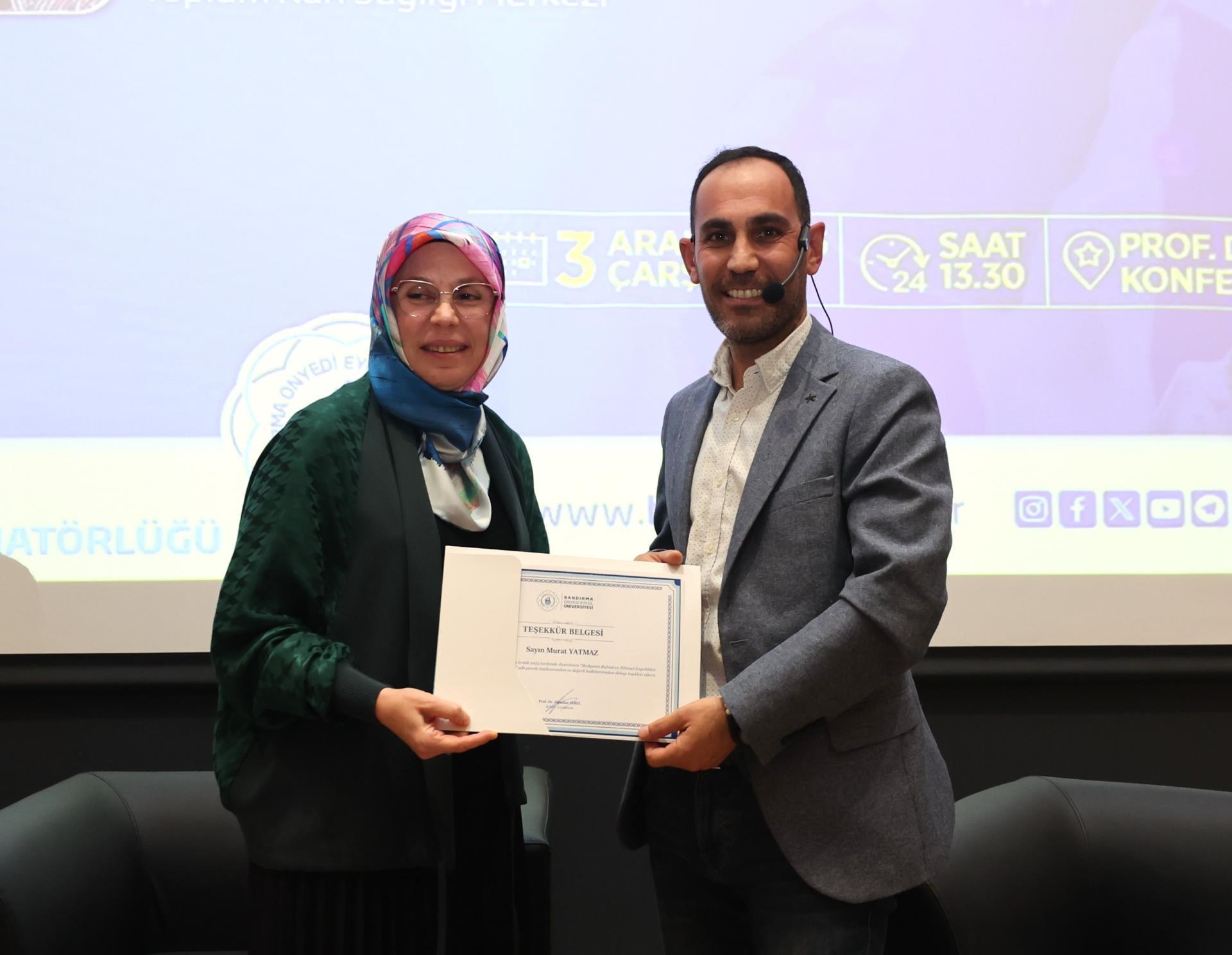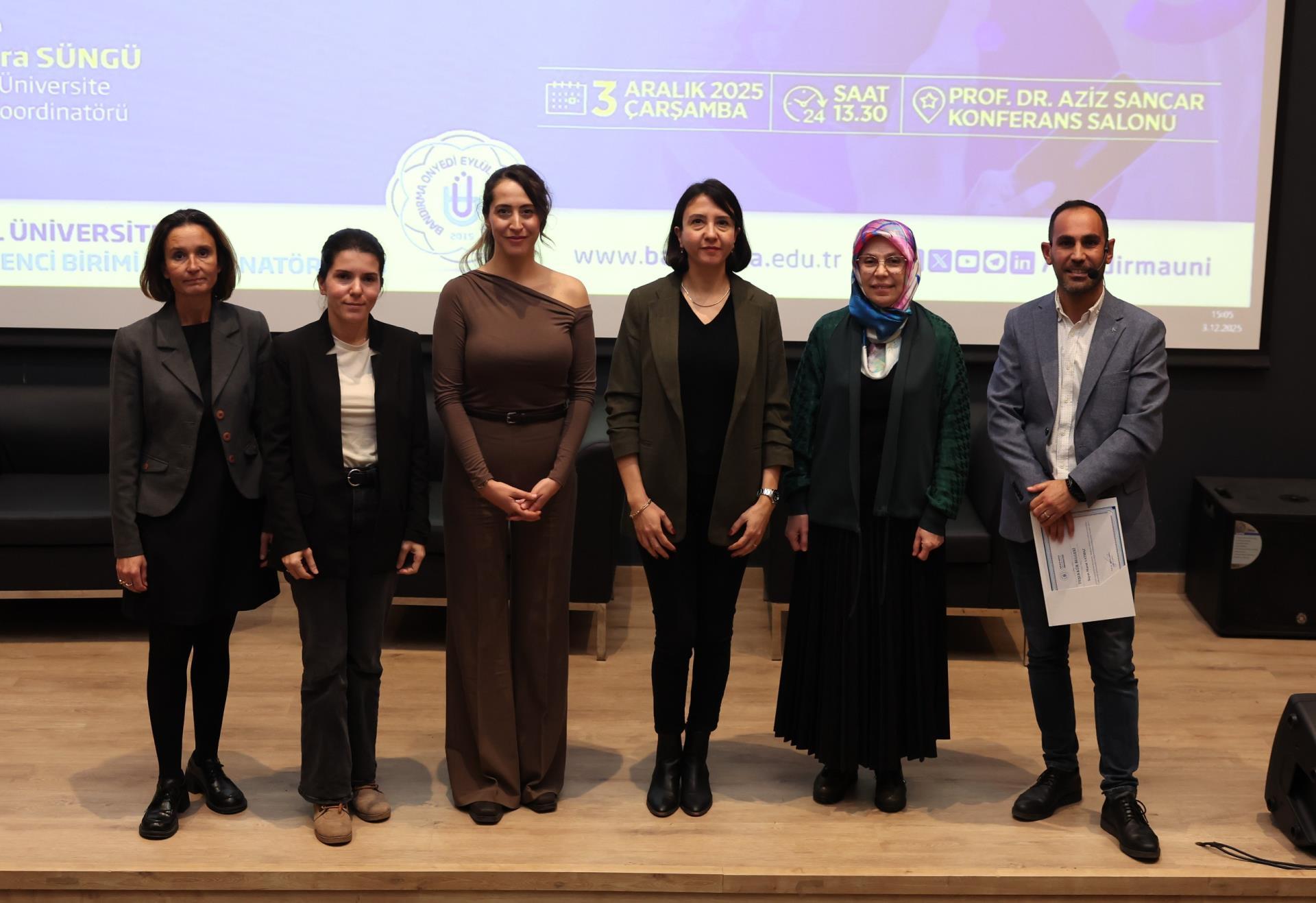 Programın sonunda konuşmacılara teşekkür belgeleri, Rektörümüz Prof. Dr. İsmail Boz’un eşi Sibel Boz tarafından takdim edildi. Etkinlik, günün anısına çekilen hatıra fotoğrafıyla sona erdi.