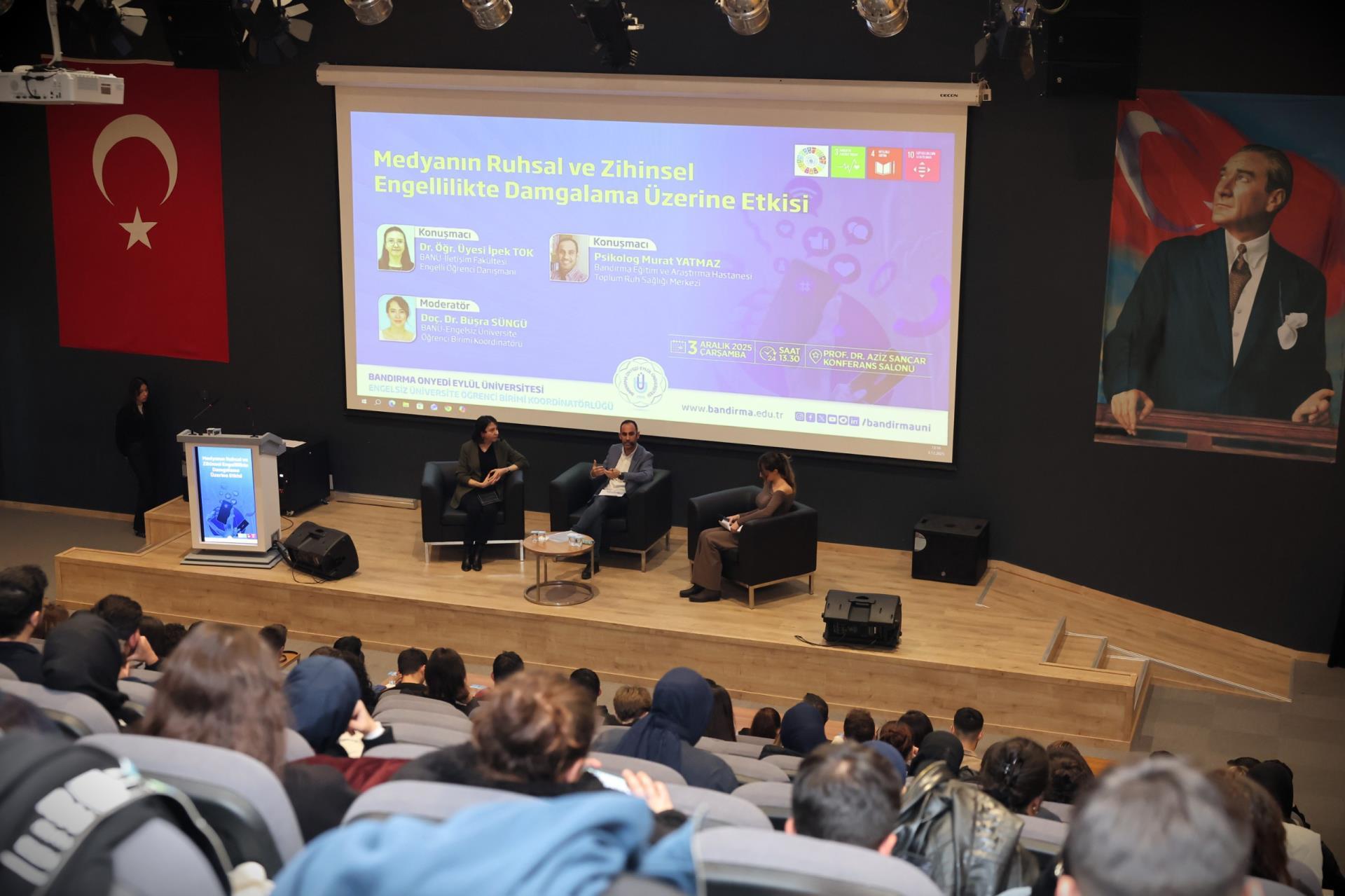 Engelsiz Üniversite Öğrenci Birimi Koordinatörlüğümüz tarafından, 3 Aralık Dünya Engelliler Günü kapsamında “Medyanın Ruhsal ve Zihinsel Engellilikte Damgalama Üzerine Etkisi” başlıklı etkinlik gerçekleştirildi. Prof. Dr. Aziz Sancar Konferans Salonu’nda düzenlenen etkinliğe; İletişim Fakültesi Dekanımız Prof. Dr. Hatice Aydın, Rektörümüz Prof. Dr. İsmail Boz’un eşi Sibel Boz, öğrencilerimiz, öğretim elemanlarımız, sağlık kuruluşu temsilcileri ve özel gereksinimli bireylerle çalışan profesyoneller yoğun ilgi gösterdi.