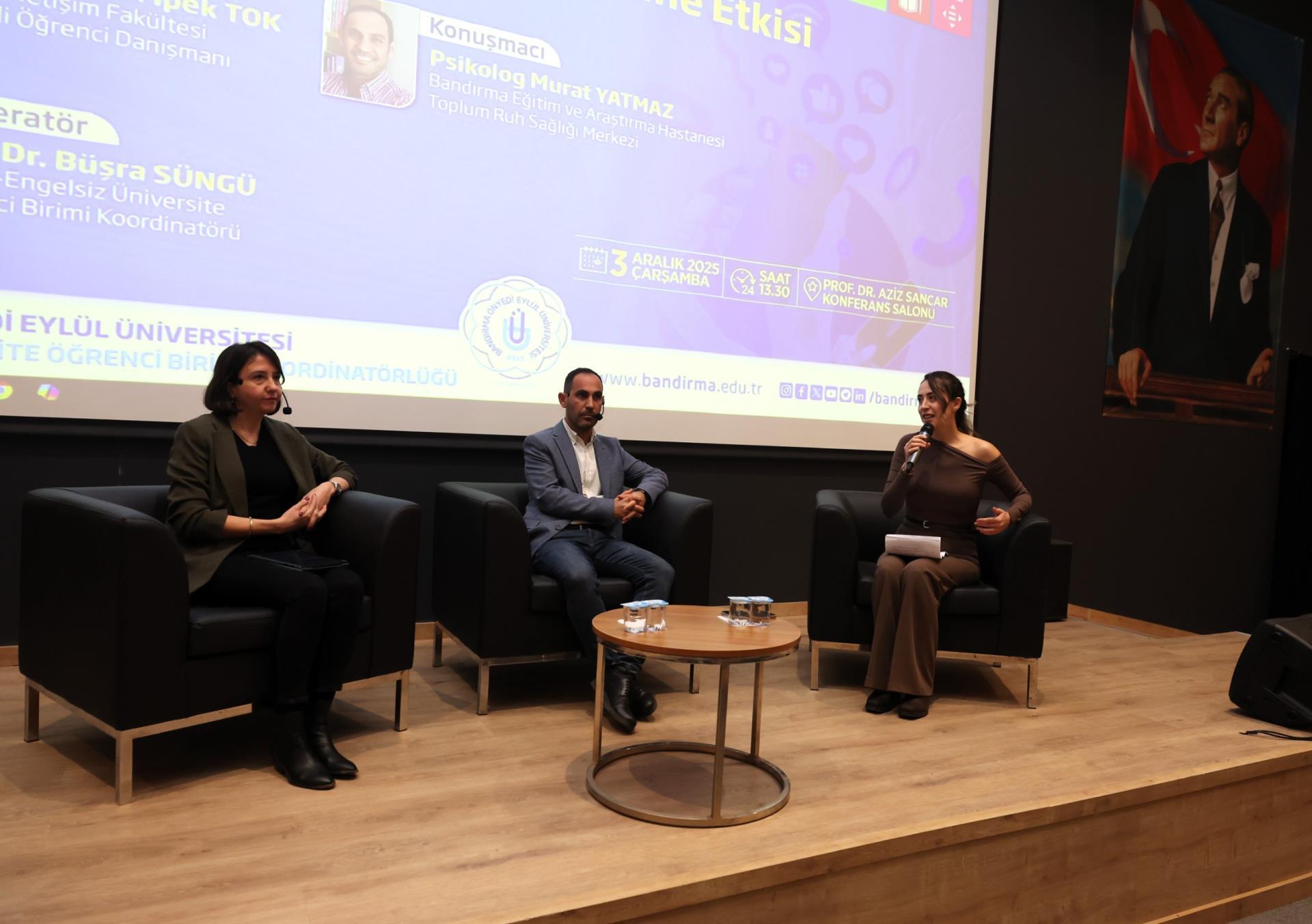 Programın moderatörlüğünü Doç. Dr. Büşra Süngü üstlenirken, programda İletişim Fakültemiz Dr. Öğr. Üyesi İpek Tok ile Bandırma Eğitim ve Araştırma Hastanesi Toplum Ruh Sağlığı Merkezi’nden Psikolog Murat Yatmaz konuşmacı olarak yer aldı. Konuşmacılar, medyanın ruhsal ve zihinsel engelliliğe ilişkin toplumsal algıyı nasıl şekillendirdiğini, damgalama süreçlerini ve bu algıların bireylerin günlük yaşamlarına yansımalarını bilimsel veriler ışığında ele aldı.