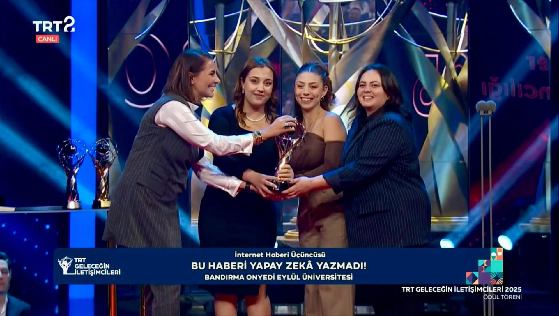 Dijital Yayıncılık (Podcast) kategorisinde, Yeni Medya ve İletişim Bölümü öğrencisi Muhammet Ergön ile Spor Bilimleri Fakültesi öğrencisi İlknur Kulbak'ın, Dr. Öğr. Üyesi Esra Tani Yıldız danışmanlığında hazırladıkları “Belgesel Tadında” başlıklı proje Altın Ödül’ün sahibi oldu. Haber Yayıncılığı (İnternet Haberi) kategorisinde, Yeni Medya ve İletişim Bölümü öğrencileri Sude Topuz, Elif Kın ve Beyza Yurttutan’ın, doktora öğrencisi Zafer Yılmaz danışmanlığında hazırladıkları “Bu Haberi Yapay Zekâ Yazmadı!” başlıklı proje Bronz Ödül’e layık görüldü. İletişim Kampanyası (Dijital Okuryazarlık) kategorisinde ise Halkla İlişkiler ve Reklamcılık Bölümü öğrencisi Çağdaş Uslu’nun, Doç. Dr. Mehmet Sinan Tam ve Arş. Gör. Beyza Türkyılmaz danışmanlığında geliştirdiği “Net Anla” isimli proje, TRT Özel Ödülü’nü kazandı.